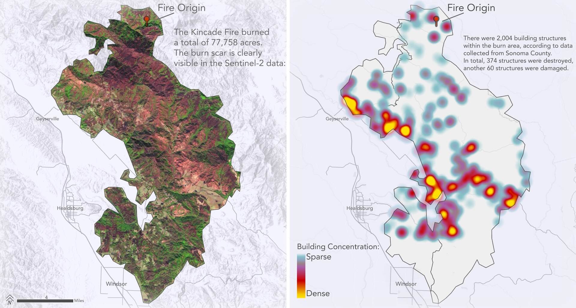 The maps below were created in ArcGIS Pro. I created a heat map to visualize the concentration of buildings within the fire boundary using building data from the county of Sonoma. Click here for full size